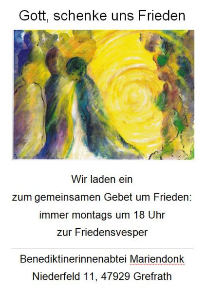 In den letzten Monaten haben wir in der Vesper am Montag besonders um Frieden in der Welt gebetet. Dieses Format werden wir nun erst einmal beenden. Denn der Advent ist eine Zeit, in der die ganze Kirche an allen Tagen sehr intensiv um Frieden betet. Christus ist der König des Friedens, der Friedensfürst, - seine Ankunft wird im Advent erbeten und erwartet. Sie sind herzlich eingeladen, mit uns zu beten!